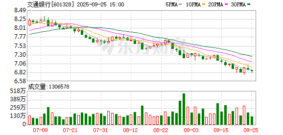 交通银行9月25日大宗交易平台出现一笔成交,成交量290.70万股,成交金额1991.30万元,大宗交易成交价为6.85元。该笔交易的买方营业部为广发证券股份有限公司西安南广济街证券营业部,卖方营业部为国泰海通证券股份有限公司总部。
